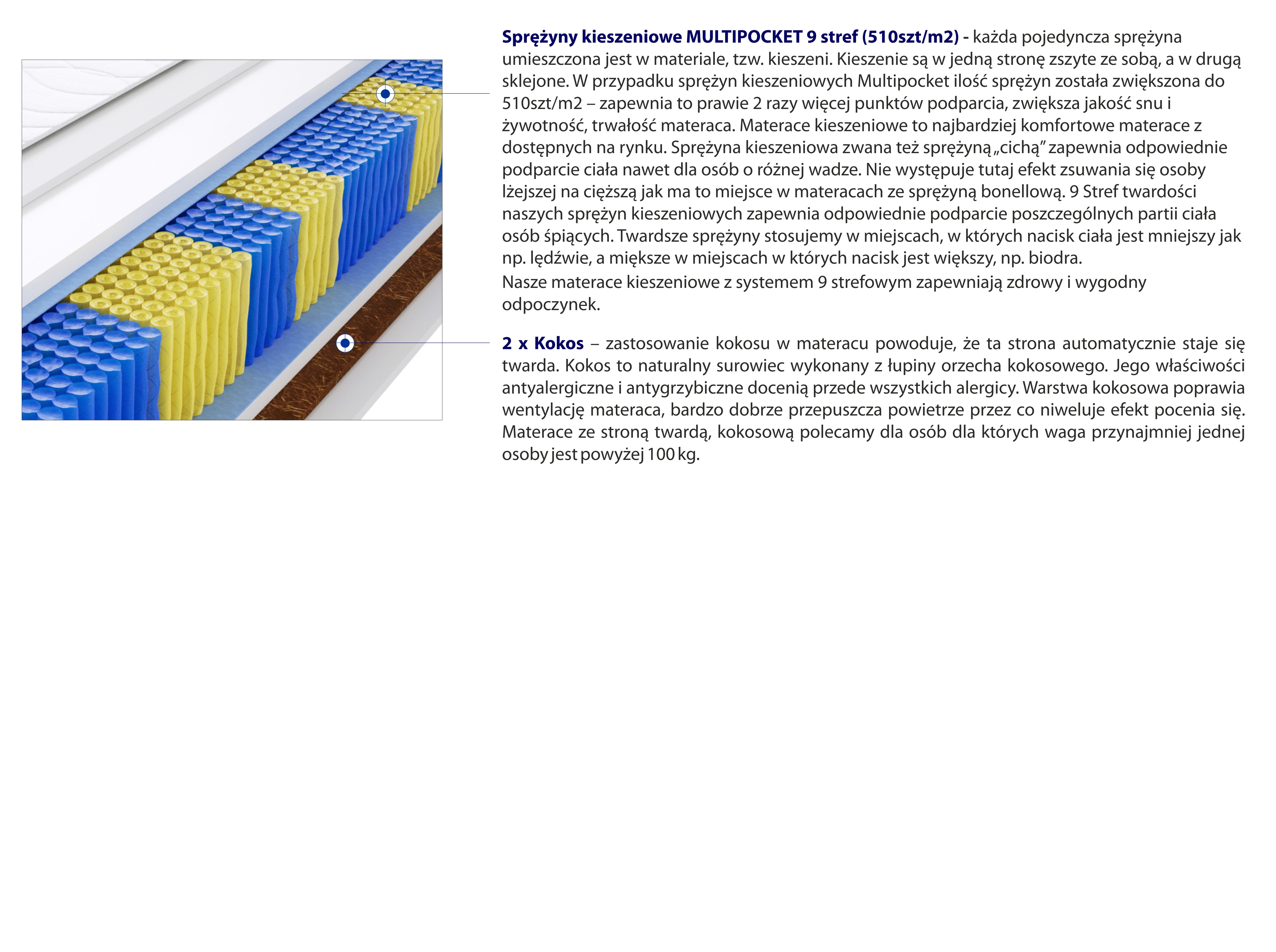– każda pojedyncza sprężyna umieszczona jest w materiale, tzw. kieszeni. Kieszenie są w jedną stronę zszyte ze sobą, a w drugą sklejone. W przypadku sprężyn kieszeniowych Multipocket ilość sprężyn została zwiększona do 510szt/m2 – zapewnia to prawie 2 razy więcej punktów podparcia, zwiększa jakość snu i żywotność, trwałość materaca. Materace kieszeniowe to najbardziej komfortowe materace z dostępnych na rynku. Sprężyna kieszeniowa zwana też sprężyną „cichą” zapewnia odpowiednie podparcie ciała nawet dla osób o różnej wadze. Nie występuje tutaj efekt zsuwania się osoby lżejszej na cięższą jak ma to miejsce w materacach ze sprężyną bonellową. 9 Stref twardości naszych sprężyn kieszeniowych zapewnia odpowiednie podparcie poszczególnych partii ciała osób śpiących. Twardsze sprężyny stosujemy w miejscach, w których nacisk ciała jest mniejszy jak np. lędźwie, a miększe w miejscach w których nacisk jest większy, np. biodra.