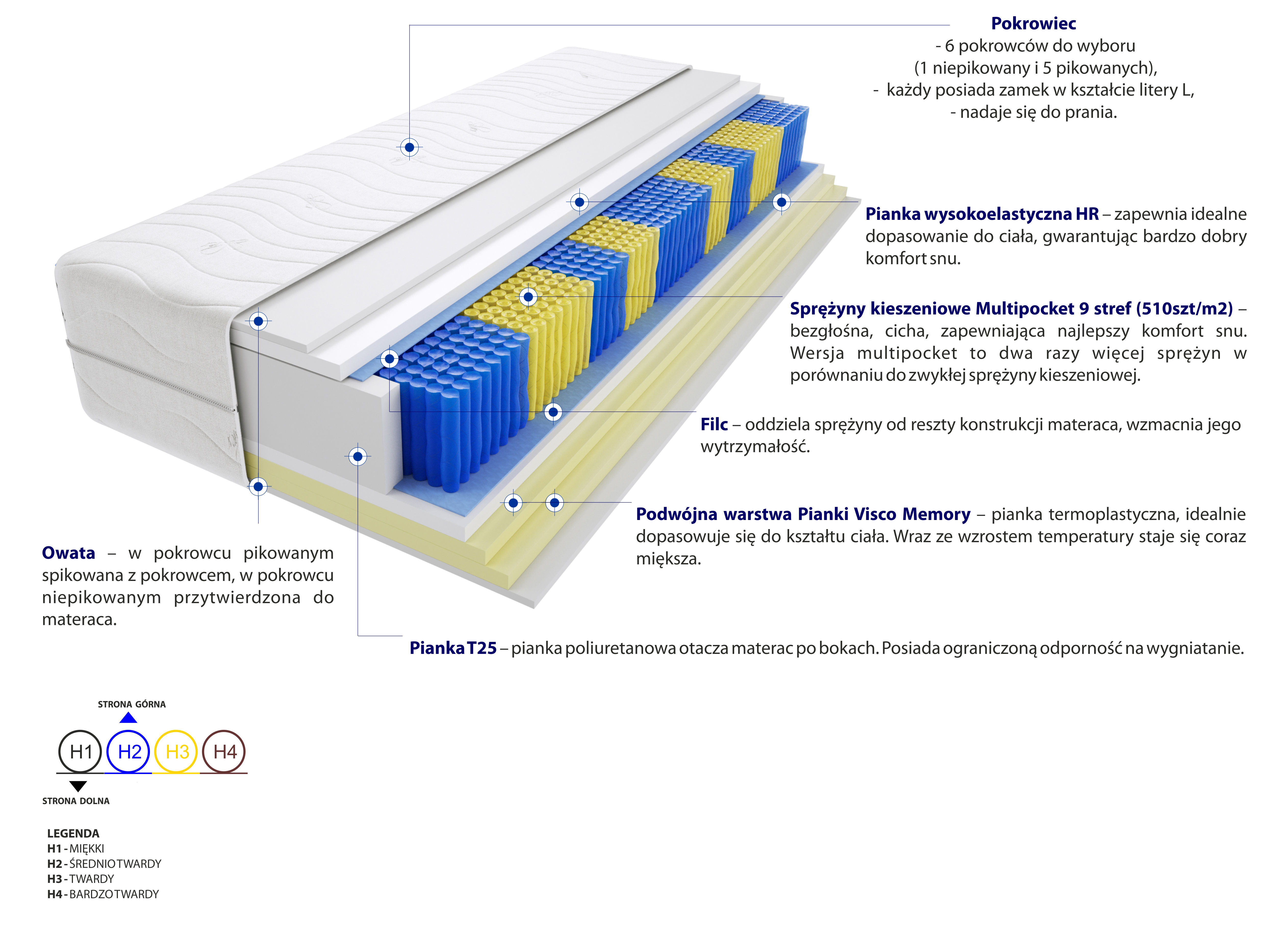 sprezyny-kieszeniowe-multipocket, pianka-wysokoelastyczna-hr, 2x-pianka-visco-memory, pianka-t25, pokrowiec, filc, wlokno-klimatyzujace