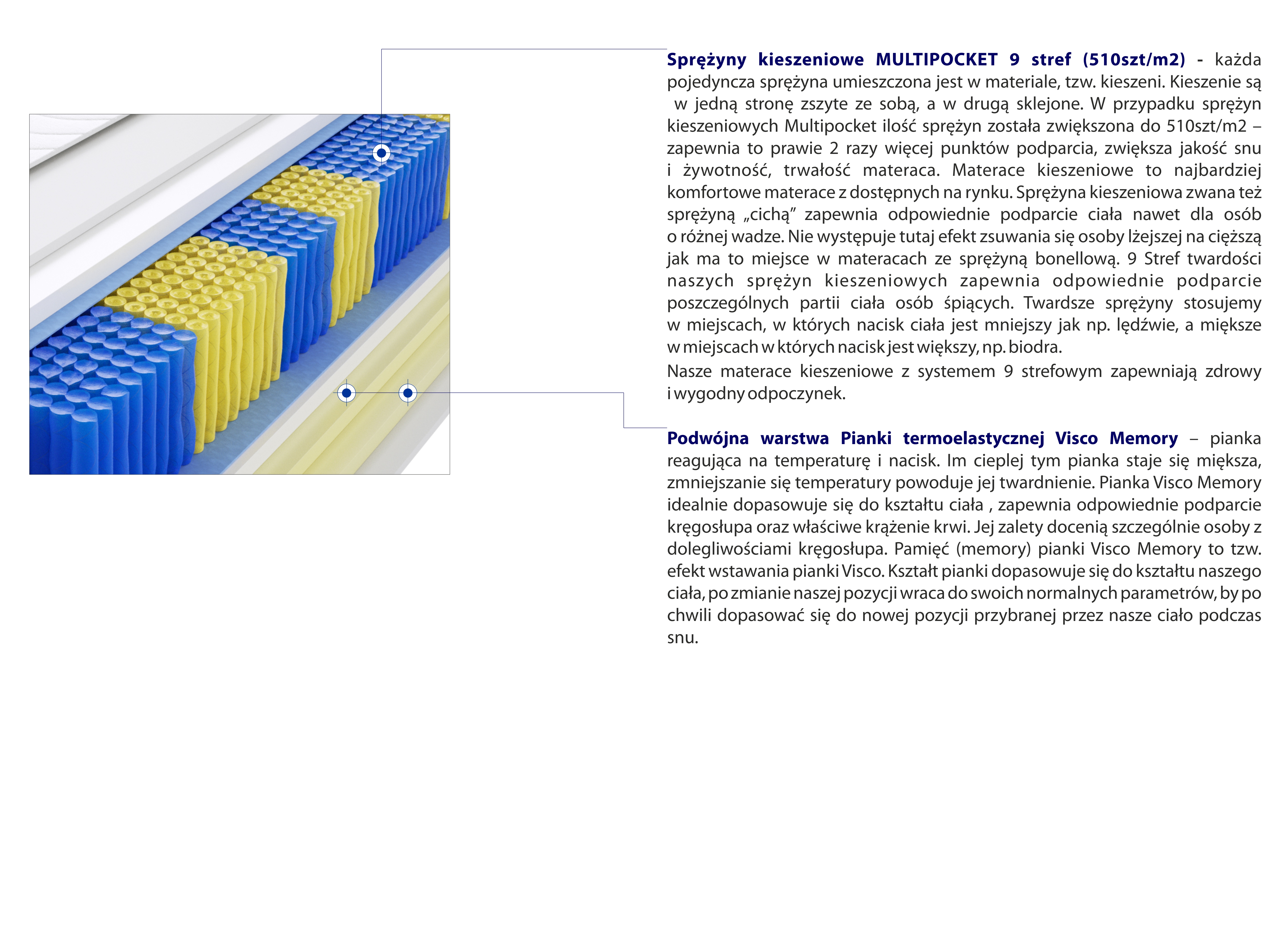– każda pojedyncza sprężyna umieszczona jest w materiale, tzw. kieszeni. Kieszenie są w jedną stronę zszyte ze sobą, a w drugą sklejone. W przypadku sprężyn kieszeniowych Multipocket ilość sprężyn została zwiększona do 510szt/m2 – zapewnia to prawie 2 razy więcej punktów podparcia, zwiększa jakość snu i żywotność, trwałość materaca. Materace kieszeniowe to najbardziej komfortowe materace z dostępnych na rynku. Sprężyna kieszeniowa zwana też sprężyną „cichą” zapewnia odpowiednie podparcie ciała nawet dla osób o różnej wadze. Nie występuje tutaj efekt zsuwania się osoby lżejszej na cięższą jak ma to miejsce w materacach ze sprężyną bonellową. 9 Stref twardości naszych sprężyn kieszeniowych zapewnia odpowiednie podparcie poszczególnych partii ciała osób śpiących. Twardsze sprężyny stosujemy w miejscach, w których nacisk ciała jest mniejszy jak np. lędźwie, a miększe w miejscach w których nacisk jest większy, np. biodra.